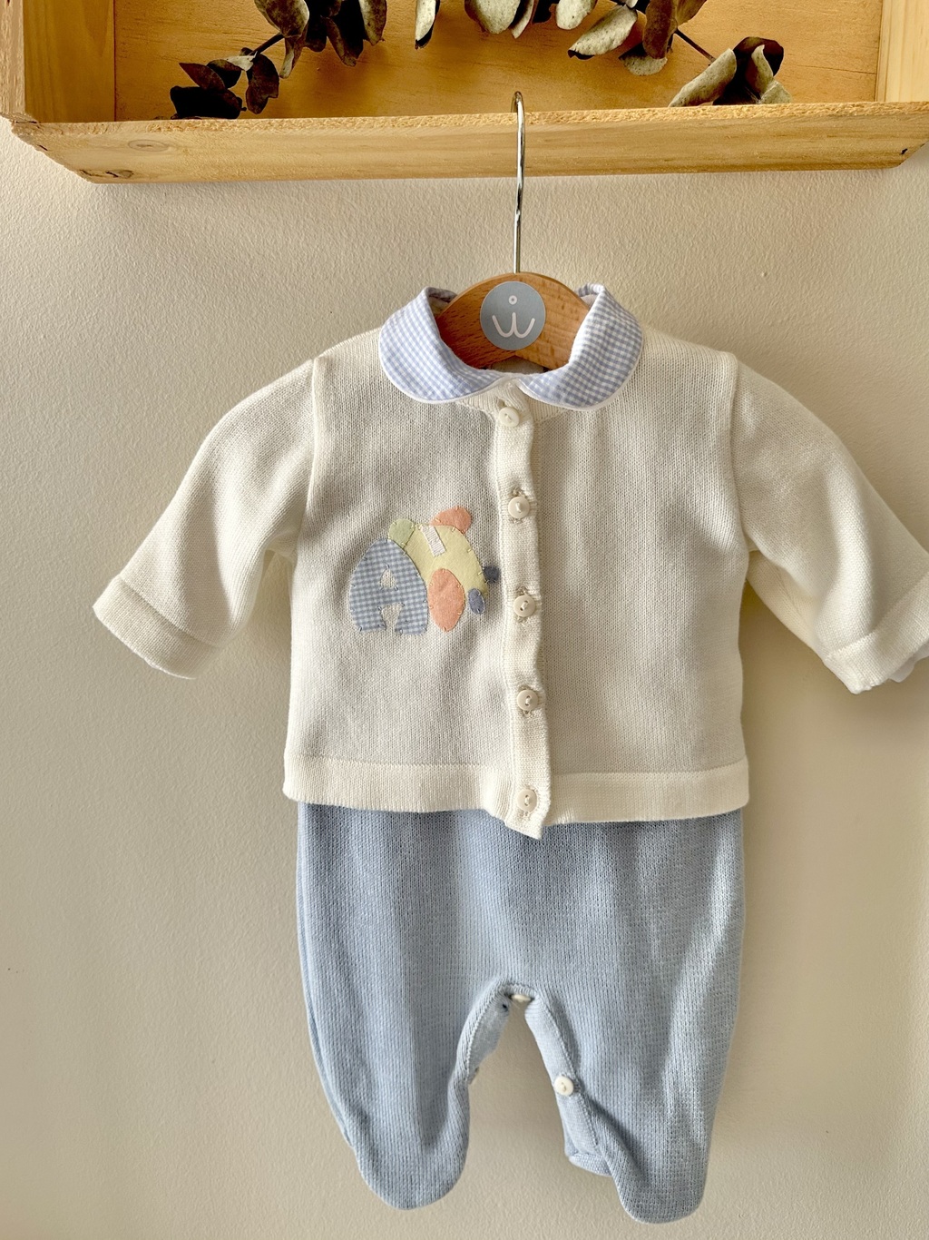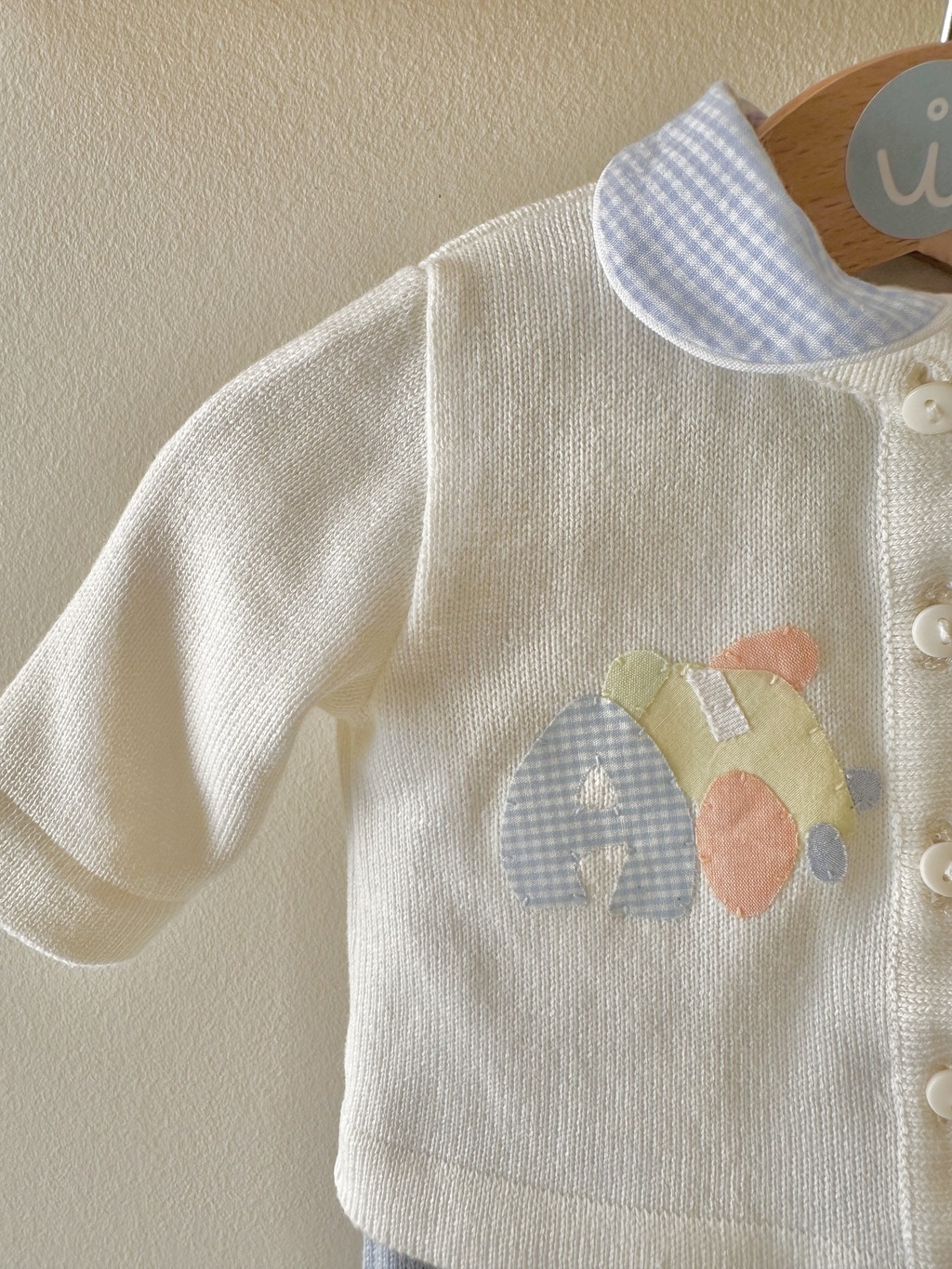 Jardineira azul clara com Carrinho bordado na frente e casaco off-white de linha anti-alérgica em tricot bordado do Aviãozinho.